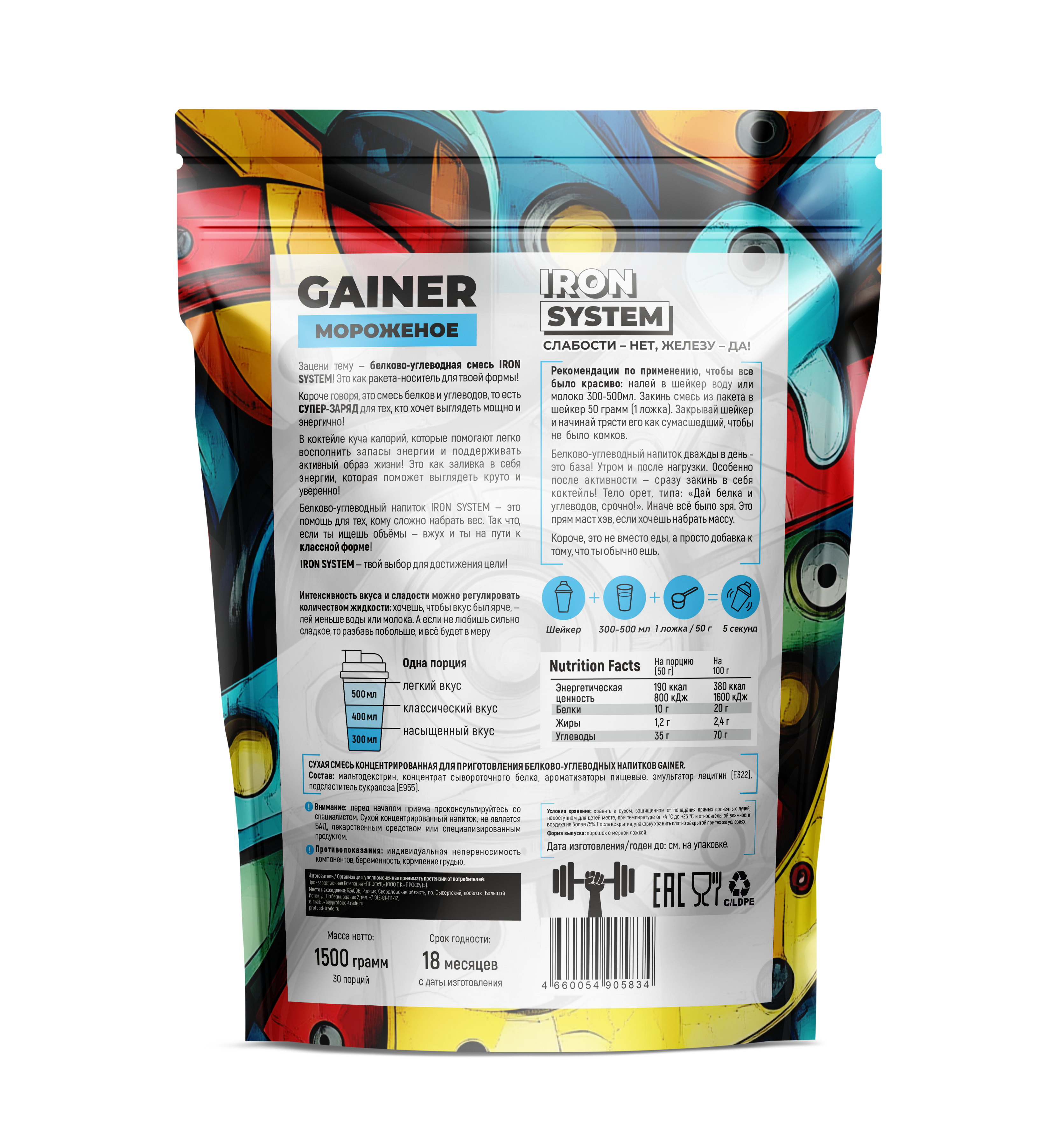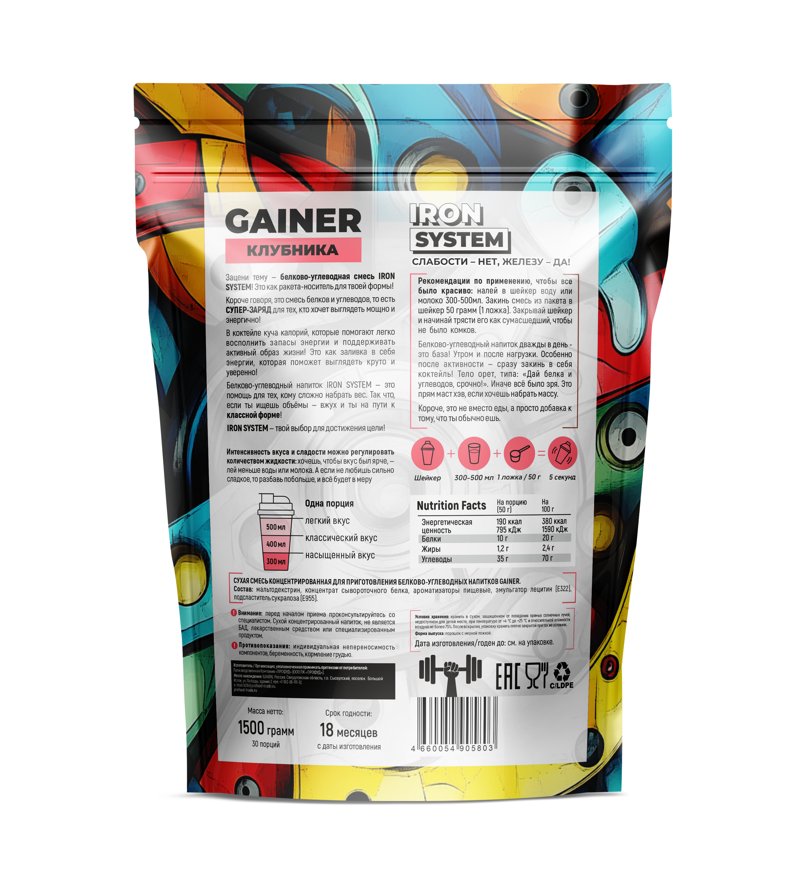 Гейнер подойдёт и как еда для похудения, если твоя цель — удержать мышцы в условиях дефицита калорий (да, он работает и так). В сочетании с протеином, креатином, BCAA и Flex Max из линейки — работает на максимум. IRON SYSTEM — это не просто спортпит. Это бренд, созданный для тех, кто в движении, любит стиль, эффект и результат. Яркий дизайн, прямой стиль, никакой скуки — только рабочие формулы и бодрый вайб. Мы с вами с 2016 года и только набираем обороты.