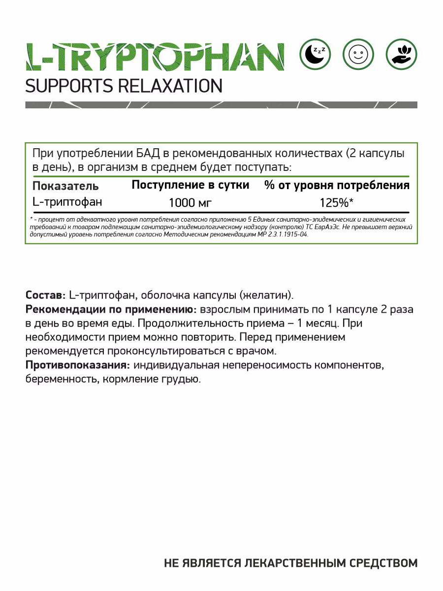 L – Триптофан — это незаменимая аминокислота, из которой синтезируются витамин В и серотонин, также необходима для создания протеинов, содержится в белковой пище.